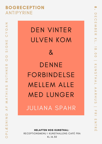 On Thursday, we invite you to a book reception in connection with the newly translated poetry collections, 'Den vinter ulven kom & Denne forbindelse mellem alle med lunger', written by the poet Juliana Spahr. It is possible to buy the poems at a special price for the event.